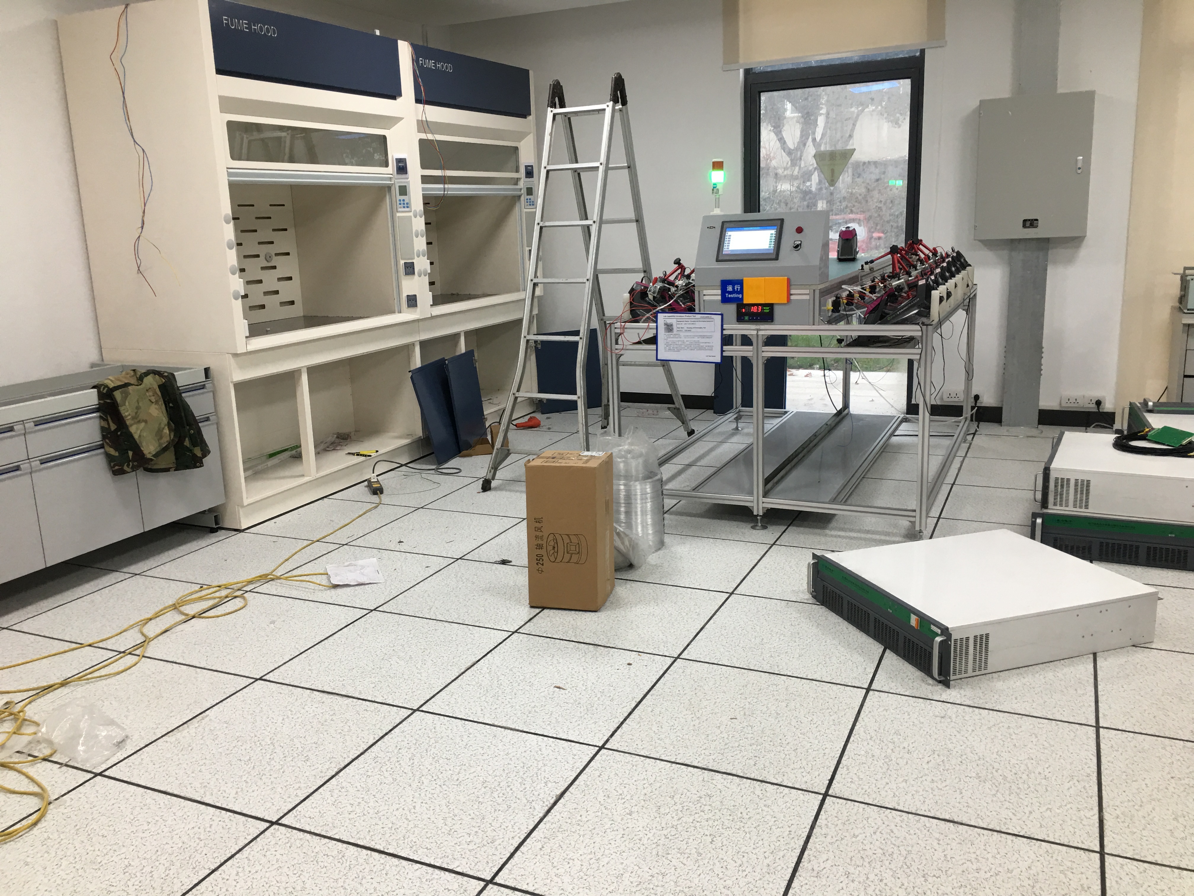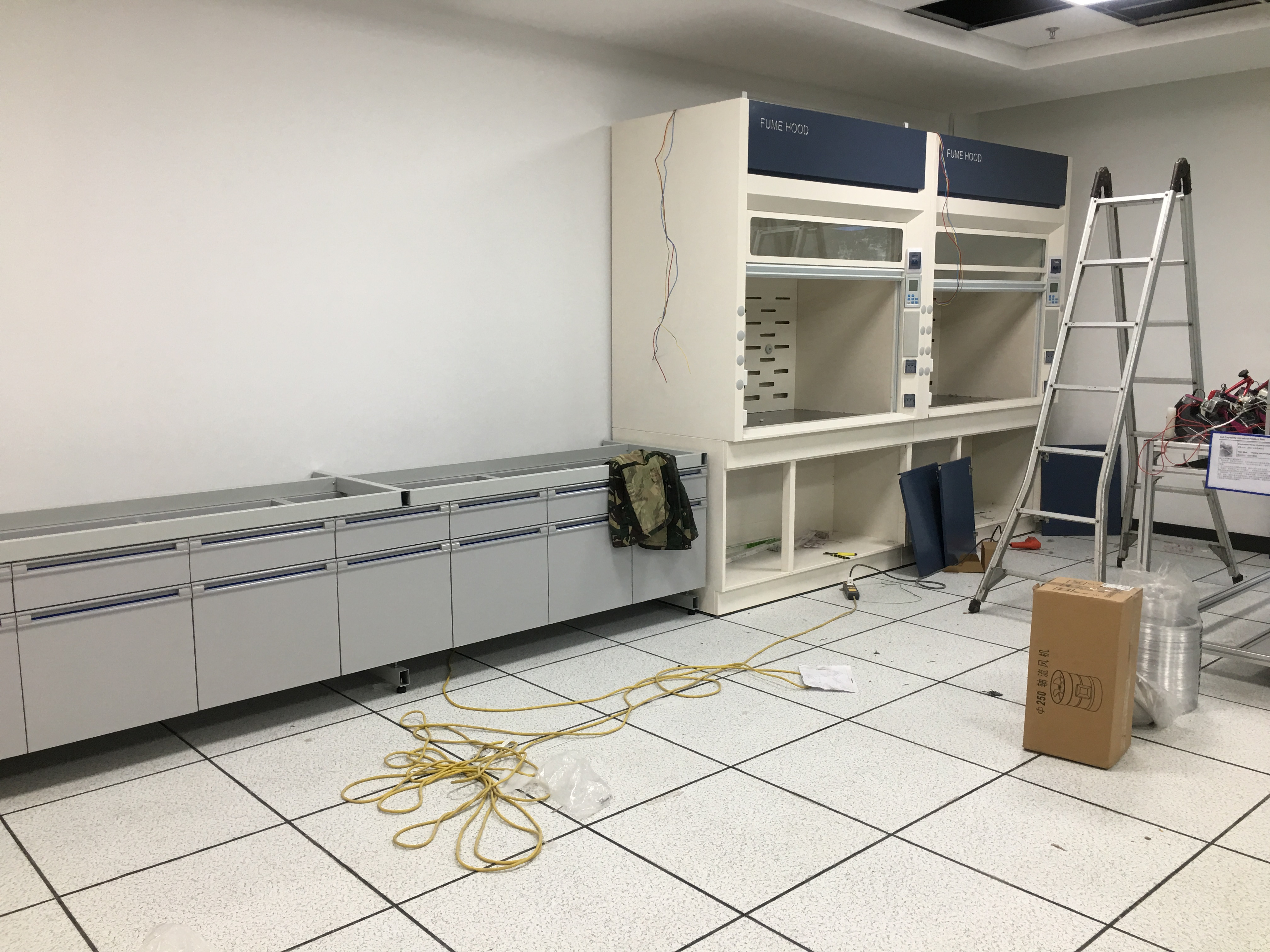蘇州某某清潔設(shè)備有限公司與2018年和奧納威簽單鋼木實(shí)驗(yàn)臺(tái) 全鋼通風(fēng)柜安裝現(xiàn)場(chǎng)【拍攝】如圖所示: